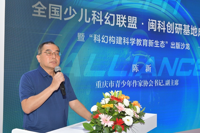 在熱烈的氣氛中,福建省委宣傳部副部長、一級巡視員陳添貴,海峽出版發(fā)行集團(tuán)黨委委員、副總經(jīng)理兼總編輯陳遠(yuǎn),全國少兒科幻聯(lián)盟創(chuàng)始人尹超,以及重慶市青少年作家協(xié)會黨支部書記、副主席陳新,共同為“全國少兒科幻聯(lián)盟•閩科創(chuàng)研基地”及基地重慶工作站揭牌。中國科幻界知名作家王晉康、董仁威、吳巖、劉慈欣等通過視頻送上祝福。