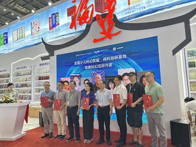現(xiàn)場還舉行了基地創(chuàng)研團(tuán)隊聘任儀式。福建省委宣傳部出版管理處處長袁俊華、福建省委宣傳部印刷發(fā)行處處長陳良勝共同為尹超、陸楊、蕭星寒、周洲、何明翰、潘亮、劉錦孜等聯(lián)盟作家頒發(fā)“科幻創(chuàng)研作者”聘書。
